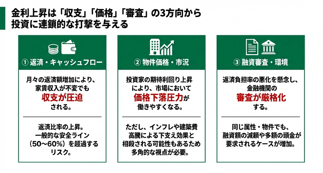金利の上昇は、一棟アパート投資のさまざまな側面に連鎖的な影響をもたらします。