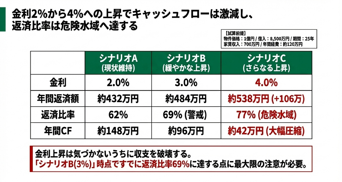 この試算からわかるのは、金利が2%から4%へ上昇するだけで年間返済額は約106万円増加し、キャッシュフローは約148万円から約42万円へと大幅に圧縮されるということです。