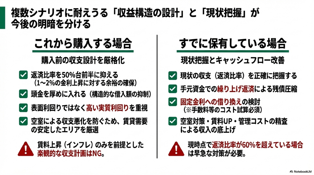 金利上昇局面で新たに物件を取得する際に最も重要なのは、複数の金利シナリオに耐えられる収益構造を最初から設計することです。