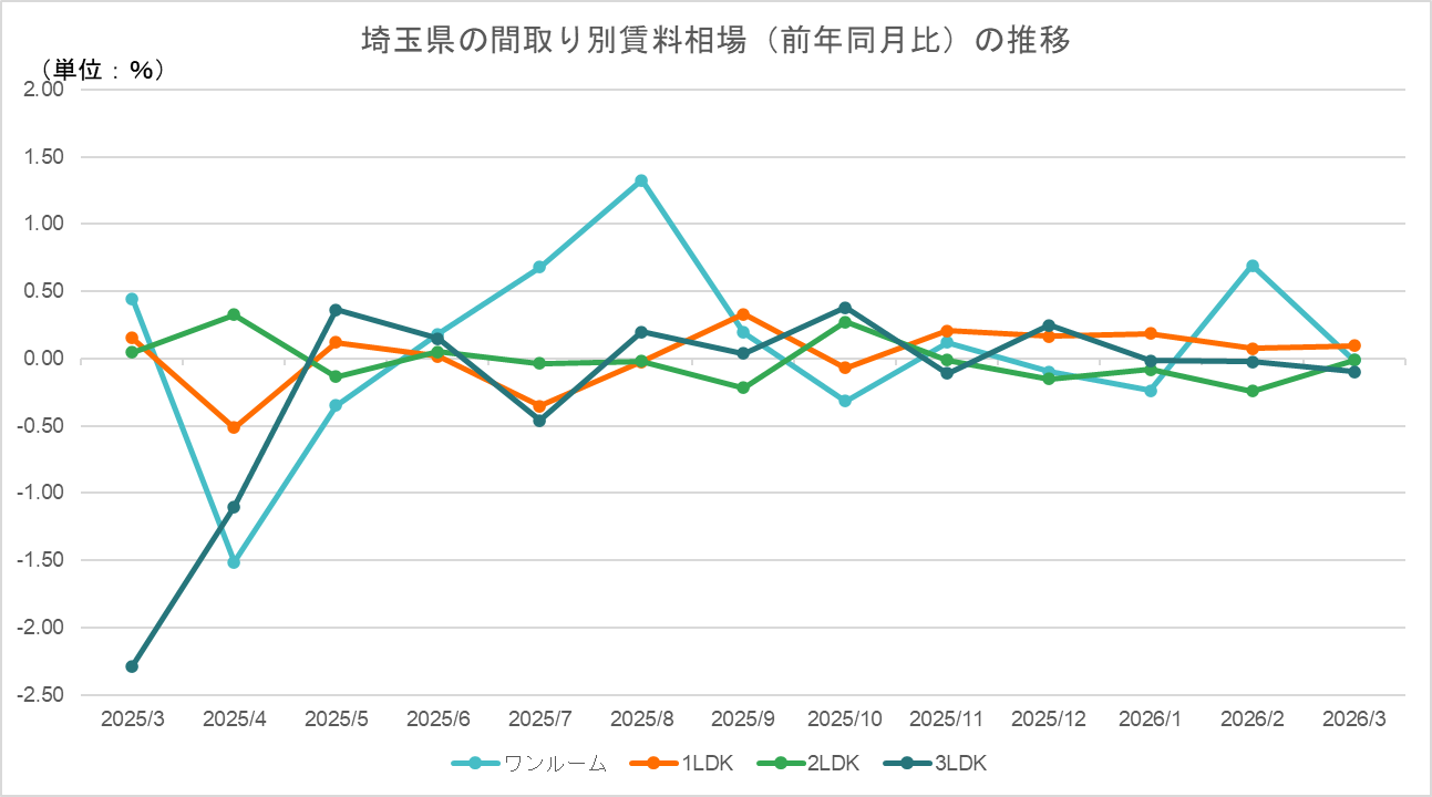 2026年3月の埼玉県は、1LDKが前年比+0.09%と安定したプラス圏を維持し、2LDKも-0.01%とほぼゼロ水準まで改善するなど、全体的に小幅な変動が続いた月となった。