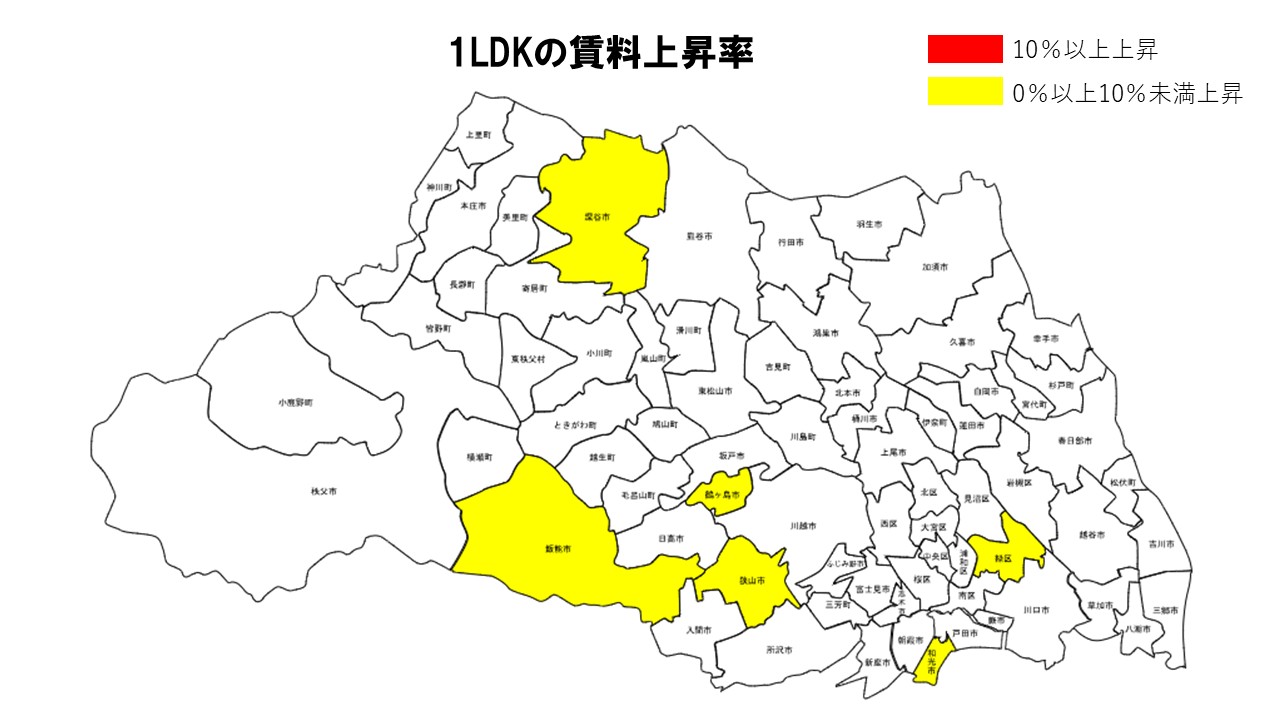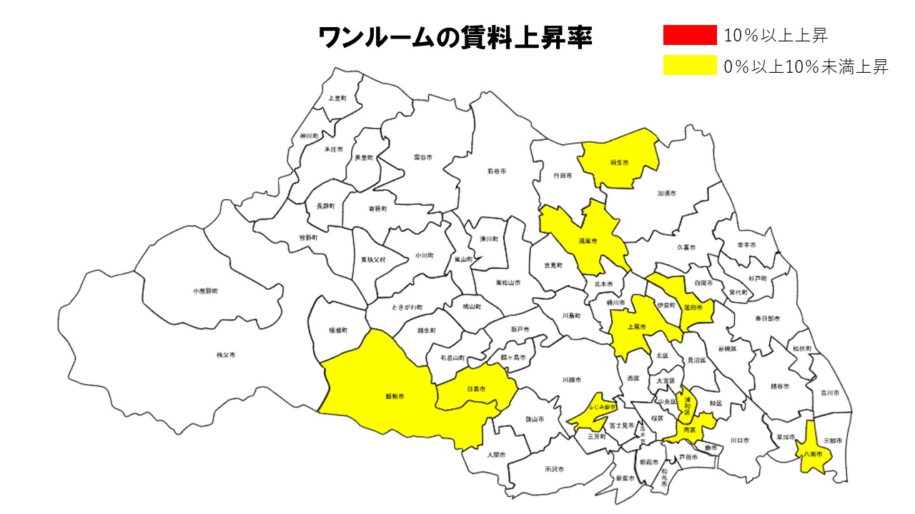 2026年3月の埼玉県ワンルームでは、ふじみ野市が前年比+8.89%でトップとなり、日高市(+5.63%)、鴻巣市(+4.26%)、さいたま市浦和区(+2.99%)が続いた。