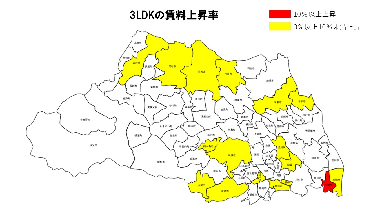 3LDKは八潮市が前年比+11.94%と突出した上昇でトップとなり、幸手市(+4.17%)、深谷市(+2.82%)、三郷市(+2.63%)が続いた。